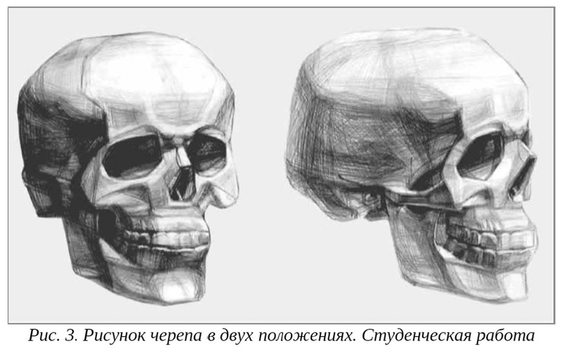 Необходимо чётко передавать в рисунке формы основных костей черепа, их границы. В натурной постановке они не всегда ясно различимы, поэтому необходимо, во-первых, изучить и запомнить формы и названия костей по анатомическим таблицам, во-вторых, в процессе работы не следует ограничиваться наблюдением с одной точки: полезно рассмотреть натуру поближе и с разных сторон.
