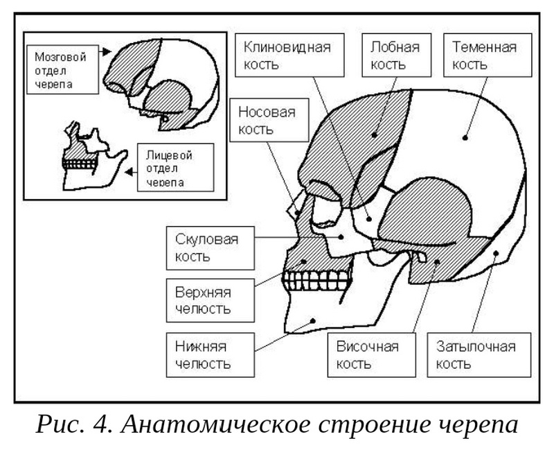 Череп делится на две части: мозговую и лицевую. Мозговая часть включает в себя: 1) лобную кость; 2) две теменные кости; 3) две височные кости; 4) две клиновидные кости; 5) затылочную кость. Лицевая часть черепа состоит из: 1) верхней челюсти; 2) двух носовых костей; 3) скуловой кости; 4) нижней челюсти.