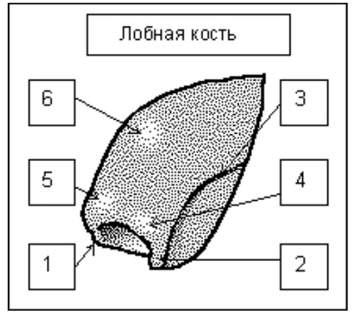 Ее нижняя часть образует верхние края глазниц, ограниченных носовым (1) и двумя скуловыми отростками (2). От каждого скулового отростка вверх и в сторону затылка отходят височные линии (3), а к переносице – надбровные дуги (4), завершающиеся двумя выступами надпереносья (5). Верхняя, передняя и две боковые части поверхности лобной кости плавно соединяются в точках лобных бугров(6) (в этих точках при ярком освещении образуются блики).