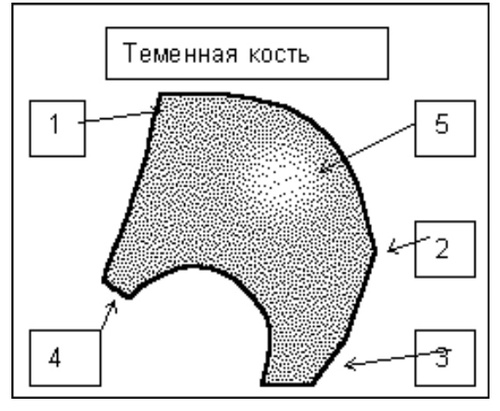 Она имеет четыре угла: один примыкает к парной теменной и лобной костям (1), второй – к парной теменной и затылочной (2), третий – к височной и затылочной (3) и четвертый – к височной и клиновидной (4). Верхняя, боковая и задняя части поверхности теменной кости плавно сходятся в ее центре, образуя характерный выступ (5).