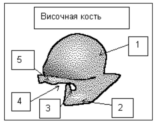 Она состоит из округлой височной поверхности (1), сосцевидного отростка (2), расположенного позади слухового отверстия (3) и сустава нижней челюсти (4), а также скулового отростка (5), направленного к лицевой части и составляющего вместе с височным отростком скуловой кости форму скуловой дуги.