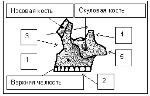 Образует своей верхней частью нижние края глазниц, в средней части имеет щечную ямку (1), внизу переходит в альвеолярный отросток (2), на котором располагается 16 зубов.