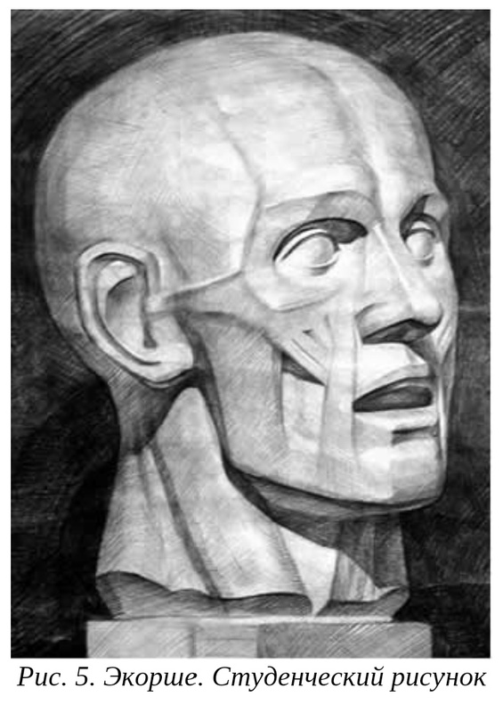 В рисунке экорше применяются те же приемы, что и в рисунке черепа, и соблюдается сходная последовательность работы. Форма черепа очень хорошо видна на гипсовой модели экорше: в частности, хорошо читается рельеф лобной, теменной и затылочной кости, выражены надбровные дуги, скуловые кости, нижняя челюсть. Из мышц наиболее рельефно просматриваются жевательная, скуловая, щечная, четырехугольная мышца верхней губы, треугольная мышца нижней губы, а также грудино-ключично-сосцевидная и трапециевидная мышцы шеи. Отчасти заметны круговая мышца глаза и височная мышца.