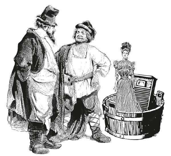 – Я? Я на театральное удовольствие всегда готов, – отвечал купец-подстриженная борода. – Ценен наш сапожный товар, ну да уж где наше не пропадало, получайте калоши кимрятской работы. Теперь за вами остановка, ваше степенство, – обратился он к усатому краснолицему купцу.