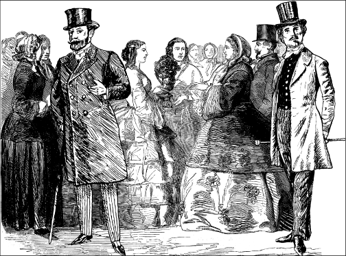 В гостиной сидят гости-поезжане, которые должны сопровождать невесту в церковь. Тут, по большей части, мужчины. Дамы ушли в спальную помогать одевать невесту.