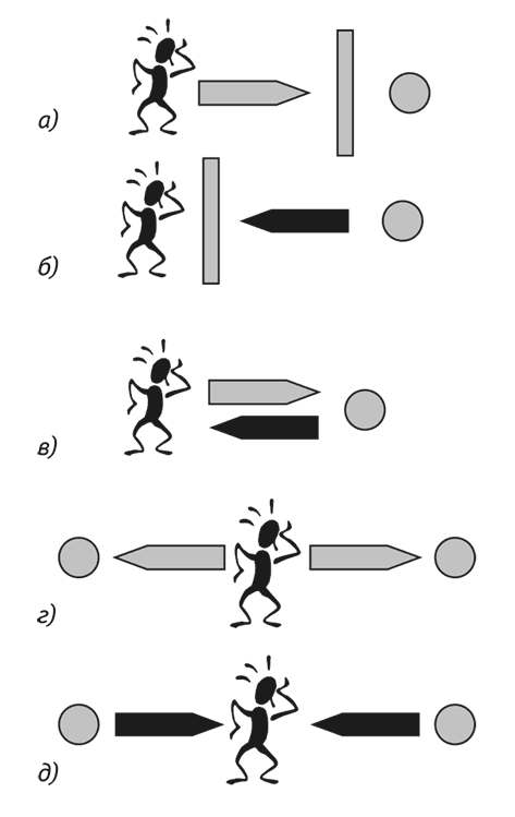 Следовательно, суть проблемы всегда состоит в дезадаптивной фиксации, но психологическая проблема может иметь несколько различных типов внутренней организации (или структуры). Эти разновидности представлены на рис. 1. На всех схемах кружок означает некоторый объект, желаемый или отвергаемый индивидом, прямоугольник – преграду, а стрелка – желание индивида либо негативное давление со стороны объекта на субъект (что может быть вызвано отрицательным желанием субъекта или отвержением).