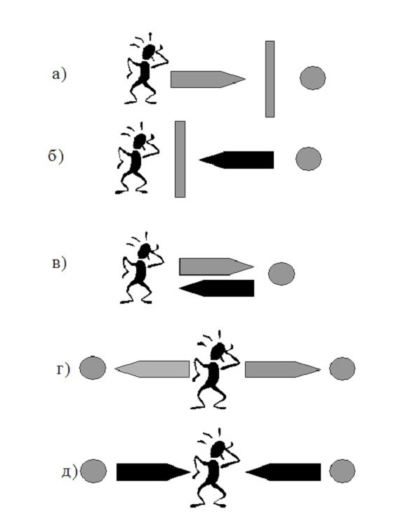На рисунке 3 (а, б) изображен более подробный анализ психологической проблемы первого типа и ее возможного решения. Кроме цели, желания и преграды, на ней схематически изображена «фантомная лапка» (стрелка поверх преграды), которой человек держит свою цель или преграду. Кроме того, маленькое сердечко изображает те чувства, которые человек вложил в желаемый им объект. Именно эта «фантомная лапка», которую человек не умеет или не хочет разжать, чтобы отпустить цель или преграду, предопределяет его зависимость и хронические негативные эмоции, которые он испытывает. Предопределяет дальнейшие болезненные формы адаптации к этому неестественному положению. А «фантомную лапку» он не может разжать, потому что вложил в объект какие-то очень важные чувства, надежды и даже части собственной личности. Когда сердечко возвращается, то влечение исчезает, что символизируется светлой стрелкой, направленной от бывшей цели и преграды (рис. 3, б). Для решения других проблем могут применяться другие техники, данный рисунок приведен для примера.