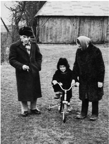 Володя на велосипеде в сопровождении дедушки Луки и тёти Кати