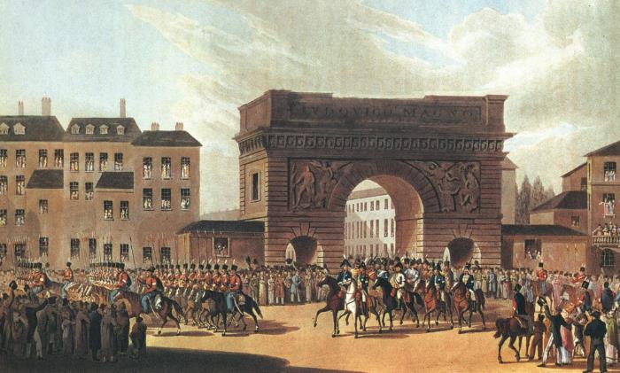 11 августа 1814 года. Возвращение в Санкт-Петербург русских войск с Отечественной войны. Из газеты «Северная почта» за 11 августа: «Лейб-гвардии полки Преображенский, Семёновский, Измайловский, Егерский, Гвардейский морской экипаж и две роты гвардейской артиллерии, возвратившиеся из славного своего похода, вступили в сию столицу. Они проходили чрез Триумфальные ворота, воздвигнутые от города в честь и славу великих подвигов, возвративших мир Европе…».