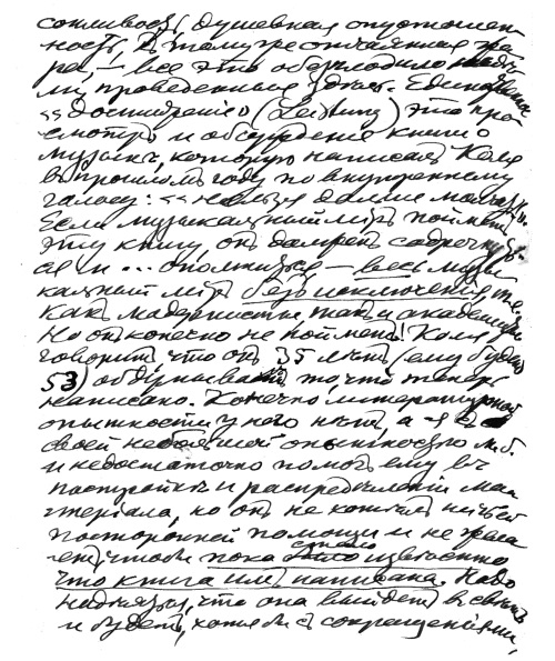 Единственное «достижение» (Leistung[57]) это просмотр и обсуждение книги о музыке, которую написал Коля в прошлом году по внутреннему голосу: «Нельзя дальше молчать». Если музыкальный мир поймет эту книгу, он должен содрогнуться и… опомниться, весь музыкальный мир без исключения, т. е. как модернисты, так и академисты. Но он конечно не поймет! Коля говорит, что он 35 лет (ему будет 53) обдумывал то, что теперь написано. Конечно, литературной опытности у него нет, а я с своей небольшой опытностью м<ожет> б<ыть> и недостаточно помог ему в постройке и распределении материала, но он не хочет ничьей посторонней помощи и не желает, чтобы пока стало известно, что книга им написана. Надо надеяться, что она выйдет в свет и будет, хотя бы с сокращениями, [Л. 41] переведена на нем<ецкий> язык.
