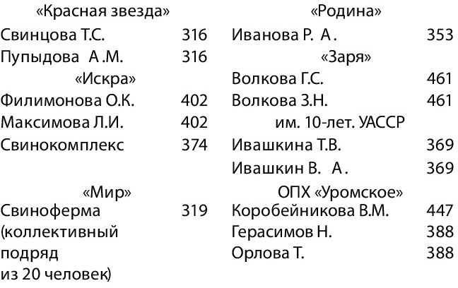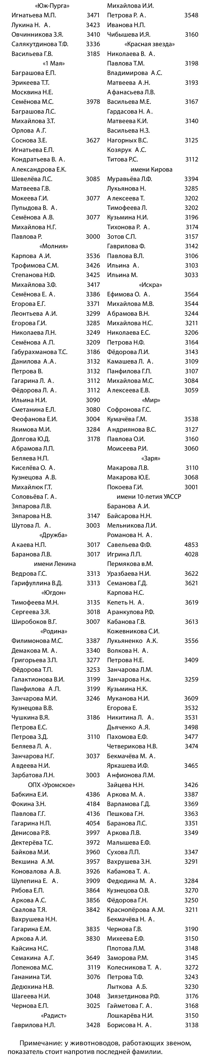При подведении ежемесячных итогов за зимне-стойловый, летне-пастбищный периоды отмечались за добросовестный труд Любовь Давлетова, Маргарита Зидиярова, Екатерина Давлетова, Зинаида Овчинникова, Галина Пасынкова, Елизавета Пронькина, Ираида Спиридонова, Зоя Камашева, Зинаида Лебедева, Таслима Салякудинова, Мария Игнатьева, Зоя Ермакова, Людмила Петрова.