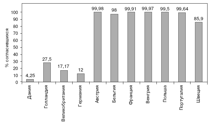 Перед вами график согласия стать донором органов в разных странах Европы. Вопрос: почему в Великобритании, Германии лишь 15 % населения готовы пожертвовать свои органы для пересадки, в то время как среди жителей Бельгии, Франции, Португалии этот показатель достигает 100 %?