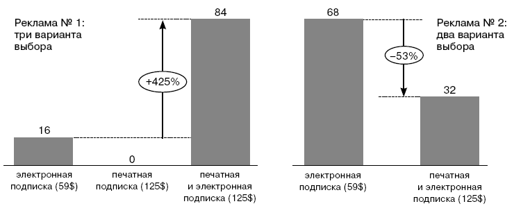 Даже заведомо бессмысленные варианты способны подтолкнуть потребителя в сторону «правильного» выбора. Профессор MIT Дэн Ариэли провел эксперимент с рекламным объявлением журнала The Economist. Редакция предлагала три варианта оформления подписки: электронную за 59 долларов, печатную – за 125 долларов или и печатную и электронную за те же 125 долларов. Наличие второго варианта выглядит дико – естественно предположить, что люди предпочтут взять за ту же цену сразу два продукта. И действительно, этот вариант не выбрал никто, большинство предпочло купить два вида подписки.
