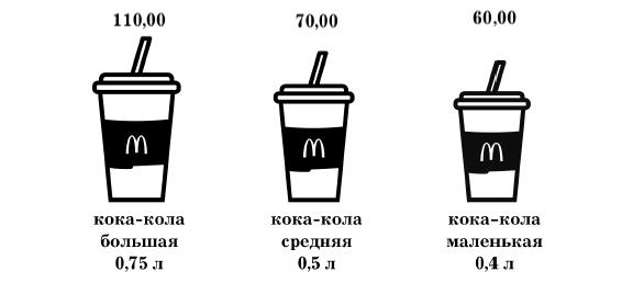 Человеку сложно точно сформулировать свои желания – да откуда я знаю, сколько миллилитров воды я хочу выпить? Я просто хочу пить. Поэтому за нас уже подумали. Смотрим на терминал самообслуживания Макдоналдса. В меню можно выбрать четыре варианта колы: маленькая (250 мл), стандартная (400 мл), средняя (500 мл) и большая (750 мл).
