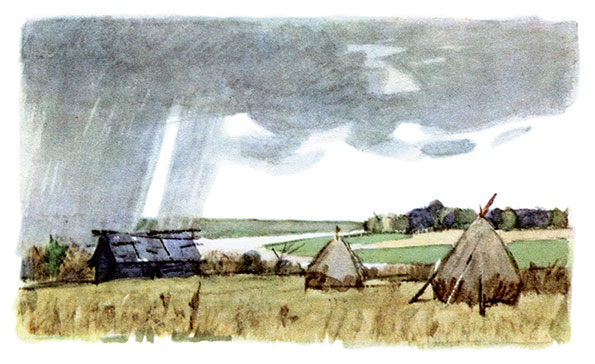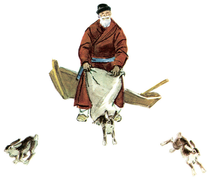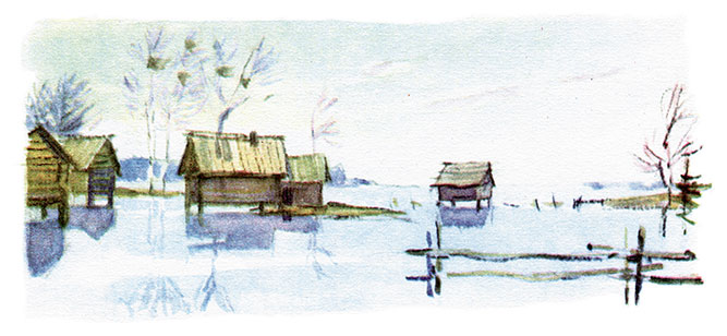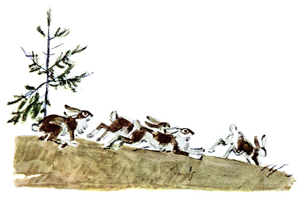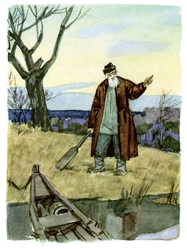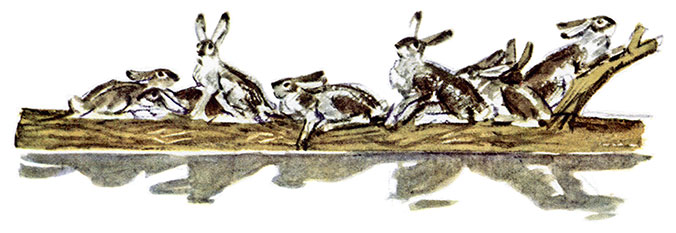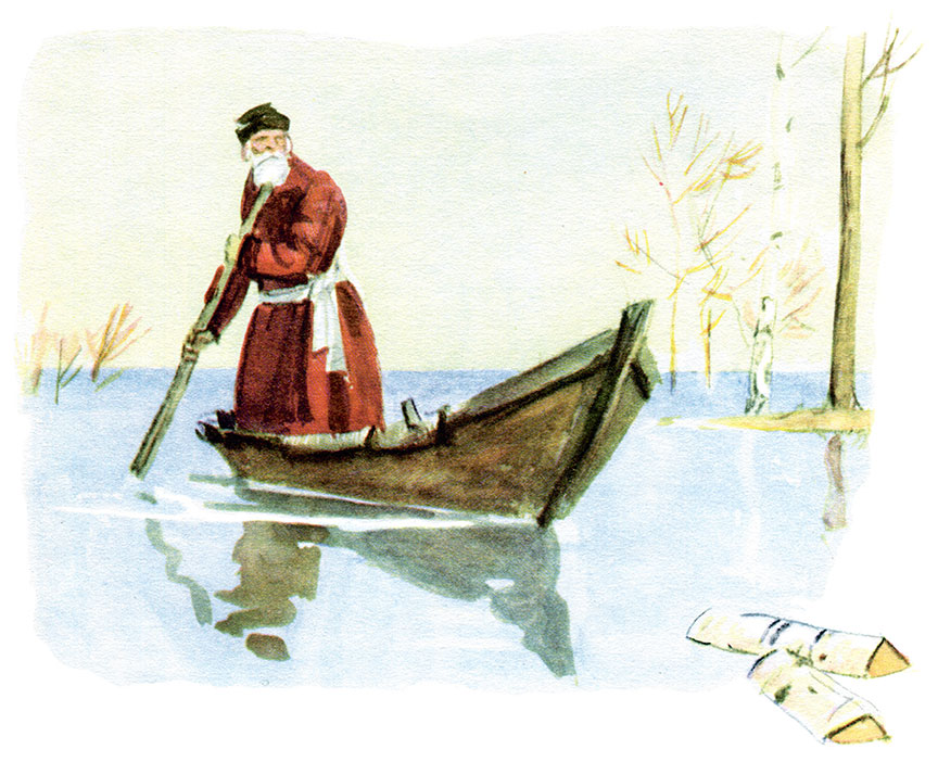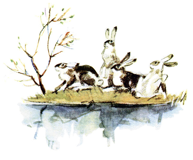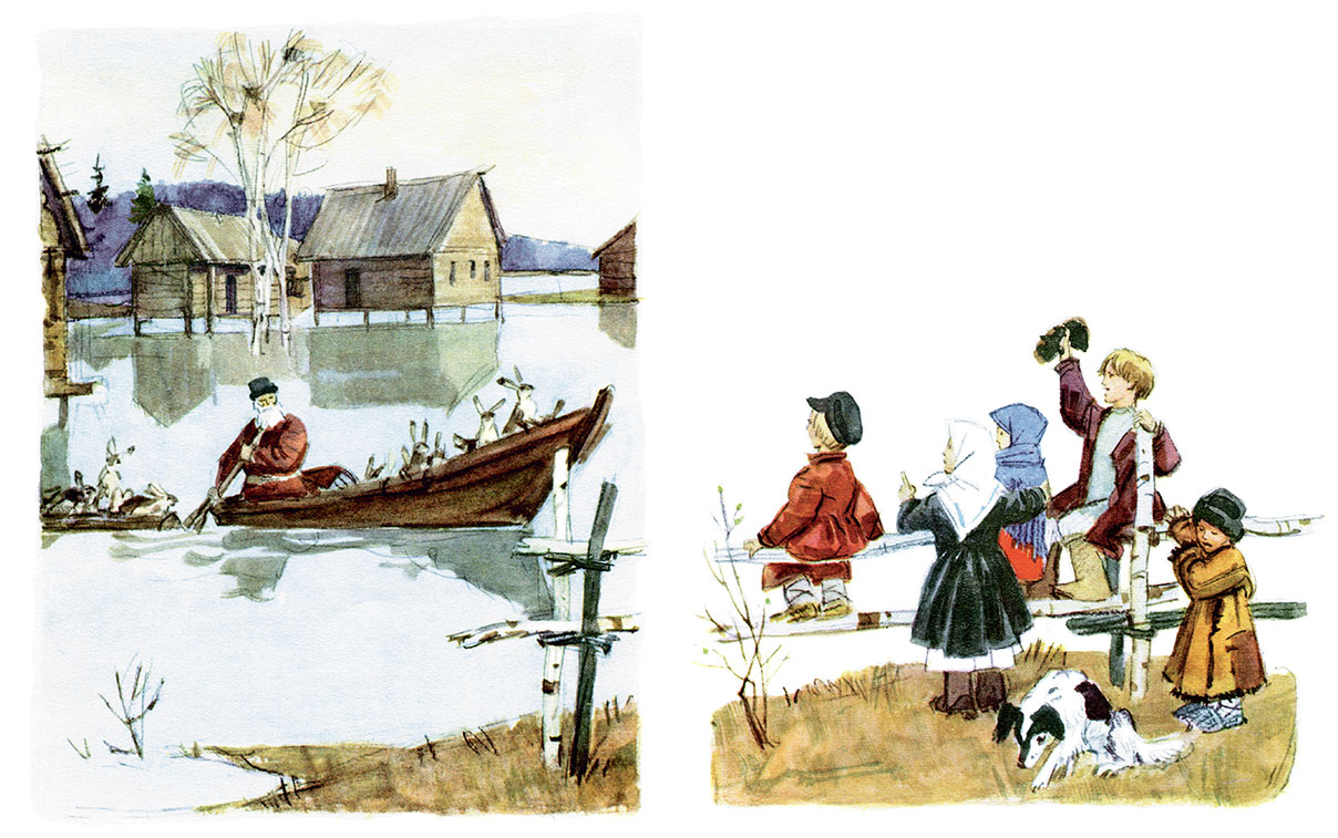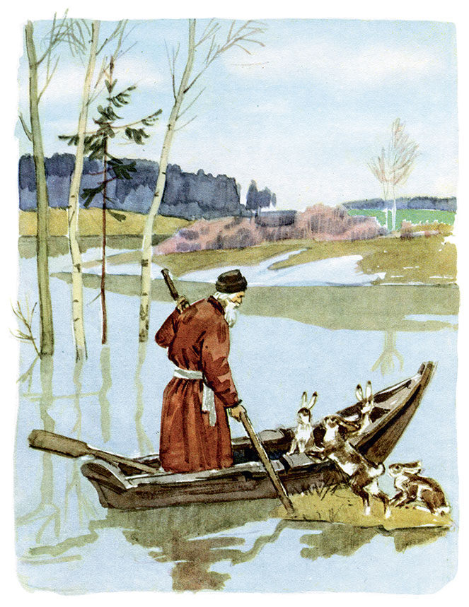 Прыгнули зайцы мои, – ничего!Только уселась команда косая,Весь островочек пропал под водой.„То-то! – сказал я, – не спорьте со мной!Слушайтесь, зайчики, деда Мазая!“Этак гуторя, плывём в тишине.Столбик не столбик, зайчишко на пне,Лапки скрестивши, стоит, горемыка,Взял и его – тягота не вели́ка!Только что начал работать веслом,Глядь, у куста копошится зайчиха –Еле жива, а толста как купчиха!Я её, дуру, накрыл зипуном –Сильно дрожала… Не рано уж было.Мимо бревно суковатое плыло,Сидя, и стоя, и лёжа пластом,Зайцев с десяток спасалось на нём.„Взял бы я вас – да потопите лодку!“Жаль их, однако, да жаль и находку –Я зацепился багром за сучокИ за собою бревно поволок…