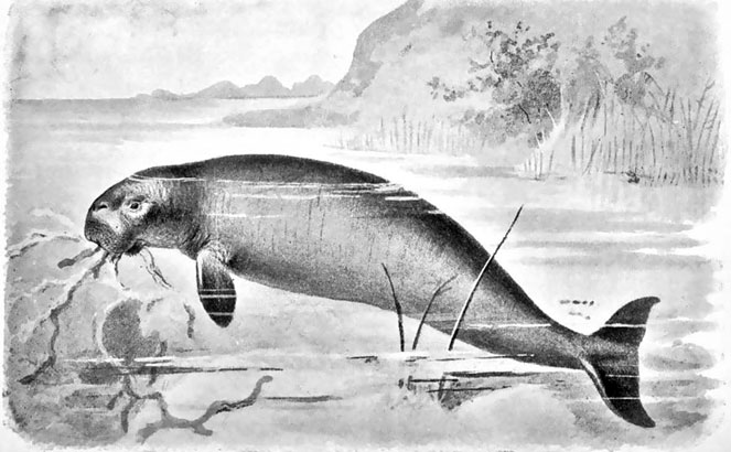 При таких драматических обстоятельствах Стеллер и открыл животное, которое станет главным действующим лицом в этой истории. В воде, при высоком приливе, он заметил несколько громадных горбатых туш, которые были похожи на перевернутые вверх дном лодки. Несколько дней спустя, когда ему удалось получше разглядеть этих существ, он понял, что они принадлежат к прежде не описанному виду; то были животные, теперь известные науке под названием «морская корова Стеллера».