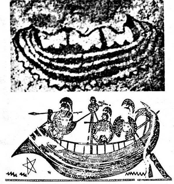 Наскальный рисунок корабля в Салманс-Краале, Южная Африка и изображение финикийского корабля на древнегреческой вазе