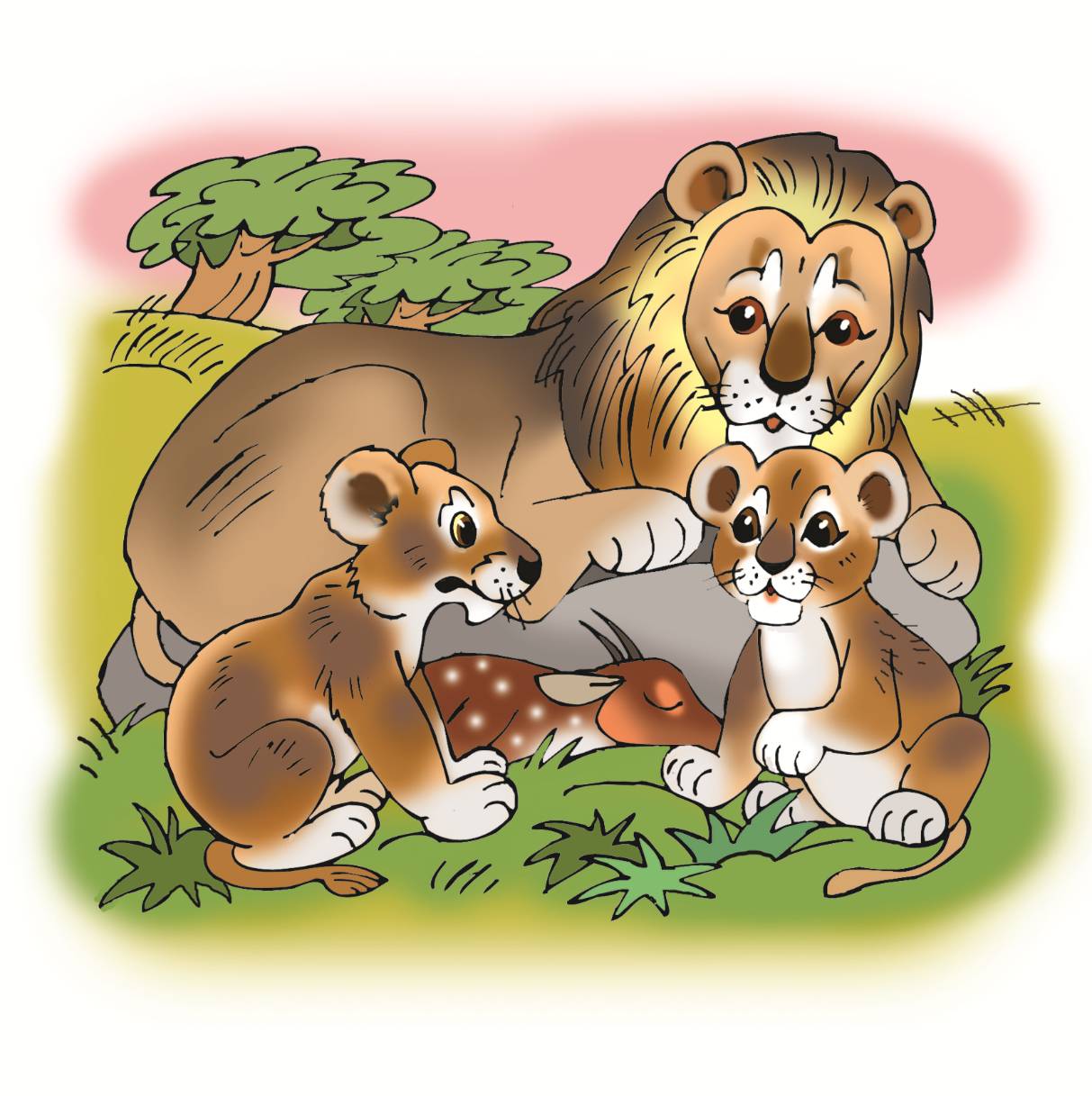 Поймали Львята на охоте дичь и подра-лись из-за добычи. Обратились ко Льву, что-бы их помирил и разделил добычу поровну.