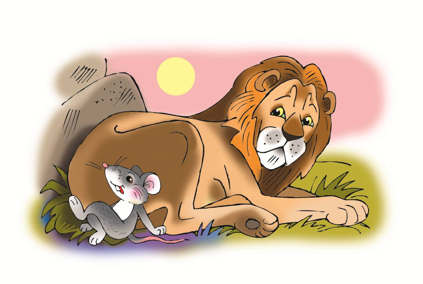 Прилёг Лев, чтобы отдышаться после бит-вы с Носорогом, которого с таким трудом одо-лел, как вдруг кто-то сзади его задел. Оглянул-ся и удивился такой наглости: перед ним в те-ни, которую создало его массивное туловище, лежал Мышонок, и ни капельки его не боялся.