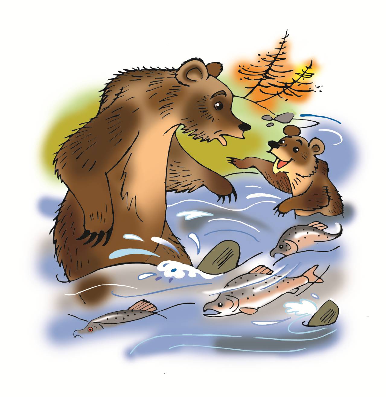 – Ты думаешь, малыш, мы здесь только рыбу ловим? – обратилась Медведица к Мед-вежонку. – Посмотри, как стремится она на не-рест, преодолевая пороги и водопады, водово-роты и мелководье, где ей приходится увили-вать от наших лап и зубов! Учись, сынок, бо-роться и рисковать, только так и можно вы-жить в дикой природе.