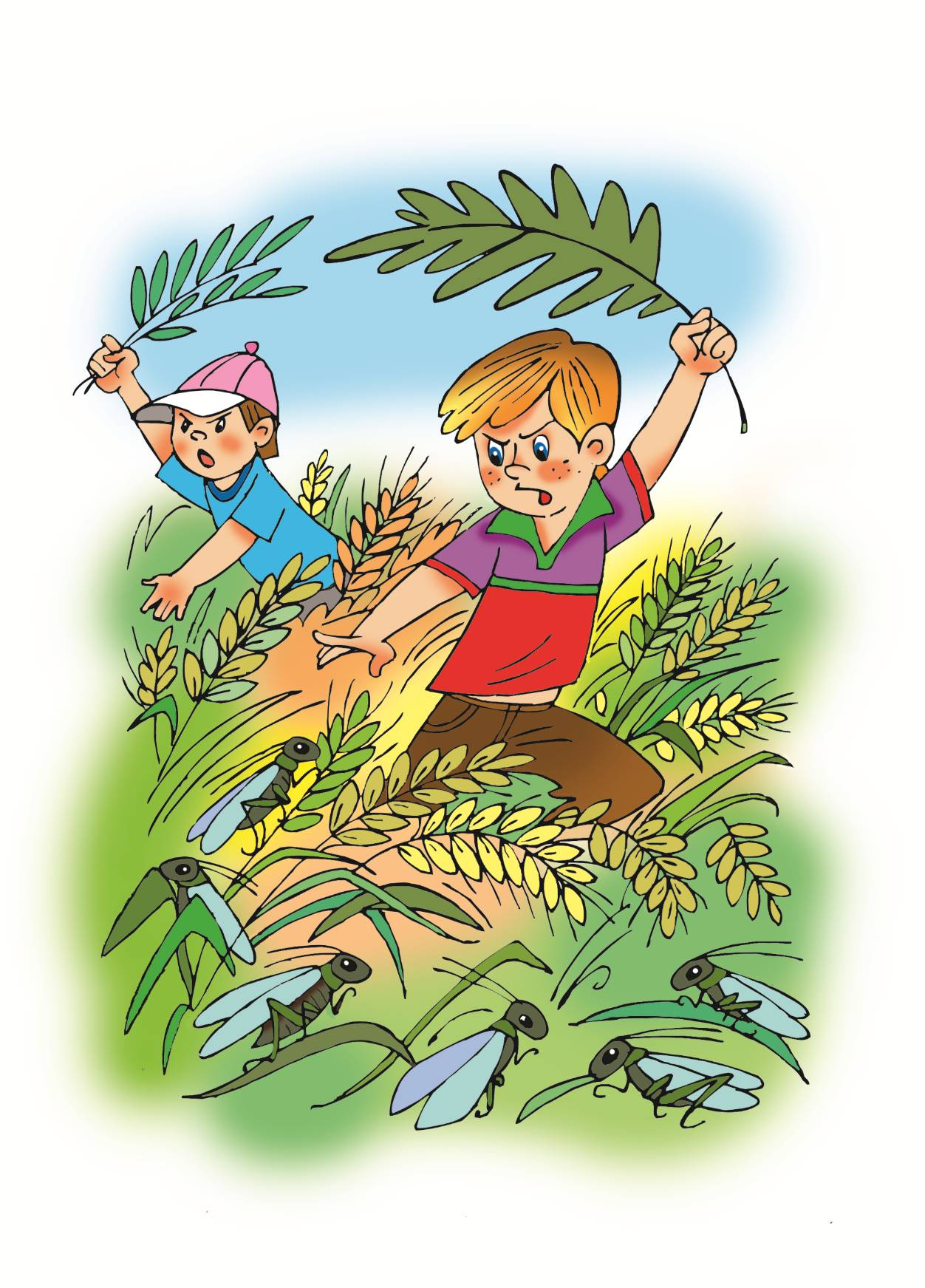Глядит человек на ниву, а на неё Саранча надвигается. И стоит на пути Саранчи подросток, пытается огромной веткой её отогнать.