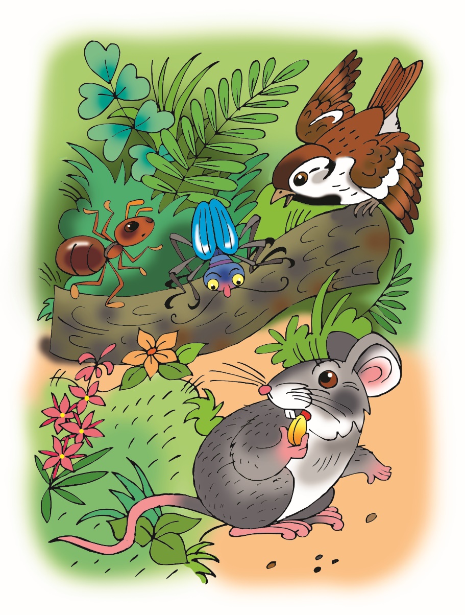 – Не ешь е-го! – за-шу-ме-ли Му-ра-вей, Жу-чок и Си-нич-ка. – Мы по-са-дим зёр-ныш-ко в по-ле, и о-се-нью о-но на-кор-мит всех до-сы-та.