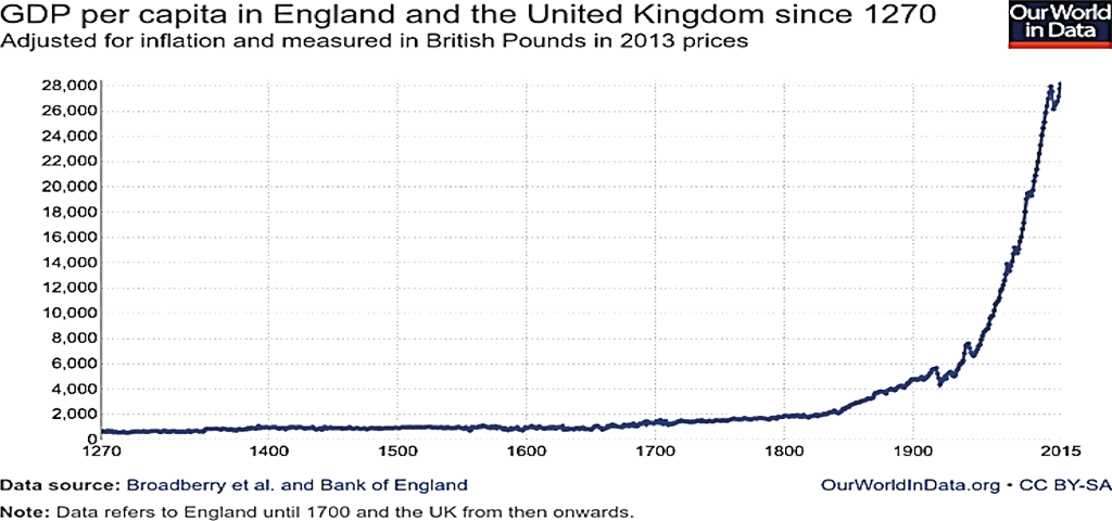 Статистические данные, охватывающие почти восемь веков, по Англии и Соединенному Королевству хорошо иллюстрируют долгосрочный тренд роста ВВП на душу населения. Мы видим, что заметный рост приходится на три недавних периода: промышленная революция и использование пара (с 1800 г.), эпохи электричества (с 1880-х гг.) и информационных технологий (с 1960-х гг.) после веков практически стагнации. На коротких промежутках положительно сказывались и некоторые демографические явления, например падение численности населения из-за эпидемий в XIV и XVII вв. (одновременно с началом довольно массовой эмиграции в североамериканские колонии), что приводило к некоторому краткосрочному увеличению доступной земли и капитала на одного работника, «улучшению статистики», но их эффект был очень недолгим (рис. 2.1).