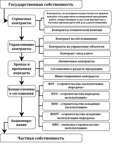 Ниже, на рисунке отражена схема трансформации правомочий собственности в зависимости от формы ГЧП.