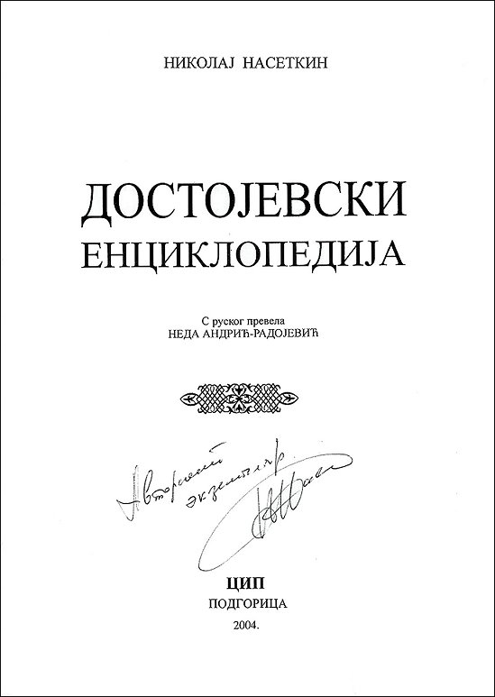 Ну так вот, пошарил я по сусекам каталога главной нашей библиотеки, все свои книги на радость себе там разыскал-обнаружил, даже и нумерованную, но малотиражную «Достоевский: портрет через авторский текст». Все и плюс ещё одну, мне неведомую, экзотическую – Николаj Насеткин «ДОСТОЕВСКИ. Енциклопедиjа» (Подгорица: ЦИП, 2004). Что за мистика? Какой это язык? Яка така Подгорица и где она находица?..