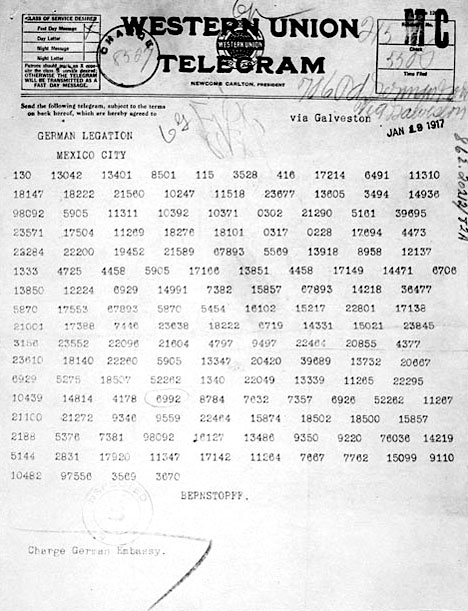 19 января 1917 года фактический министр иностранных дел Германии Артур Циммерман в шифрованной телеграмме, адресованной германскому посольству в США для передачи в дипмиссию Германии в Мехико, предложил Мексике совместное объявление войны США. Немцы гарантировали финансовую и военную помощь, а также присоединение к Мексике всех территорий (штатов Техас, Аризона и Нью-Мексико), отторгнутых у нее США в ходе войны 1846–1848 годов, что увеличило бы территорию страны примерно в два раза. Однако телеграмма Циммермана была перехвачена британской разведкой. Англичане сначала частично, а затем полностью расшифровали текст и через месяц передали его американцам. Сразу передавать США расшифрованный текст не стали, чтобы немцы не сменили код.[15] В Вашингтоне депеша вызвала переполох, и ее решили опубликовать, что и было сделано 28 февраля 1917 года.