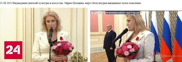 Я благодарю за награду, но чтобы с гордостью носить эту медаль на груди за заслуги перед отечеством, нужно об отечестве и говорить – говорить правду. А, правда в том, что у нас, простите, беда, и в сфере близком мне, прежде всего – в культуре. И вирус бескультурья гораздо опаснее, чем модный нынче, короновирус. Опаснее тем, что от него никто не умирает, но выкашивает он целые поколения. Без духовно-нравственной основы не может устоять ни одно государство, ни одна цивилизация, ни одна империя и примеров исторических тому масса. Отсутствие нравственности, совести, национальных героев. Вернее, они есть, но в культурном обществе их имена лучше не упоминать. Отсутствие морали приводит к необратимым процессам, приводит к деградации нации. Культура речи, культура общения убиваются на глазах. Людей стравливают друг с другом. Невооруженным глазом видно, что идет социальный эксперимент. Люди ненавидят друг друга. Сначала из-за масок, теперь из-за вакцин, скоро из-за QR-кодов, видимо. И это необходимо прекратить. В конечном счете, все поубивают друг друга. А врага никто знать-то не будет. Вы знаете, такая схема – искусство войны в Китае называется «мудрая обезьяна с горы наблюдает за схваткой двух тигров в долине». Современные войны не ведутся пушками и ракетами, они все в СМИ, науке, образовании, культуре, медицине, здравоохранении и никто даже не пытается понять, что это целенаправленный духовная диверсия по расчеловечеванию и разделению людей и остановить эти процессы… запрос на духовность и нравственность в обществе есть, поверьте – есть и я говорю про большую часть гражданского общества и не видеть – это просто преступление перед людьми. Я прошу прощения, может быть за излишнюю резкость, но просто это уже просто, это уже – крик души, это S. O. S. Уважаемый, Михаил Владимирович. Служу Отечеству!