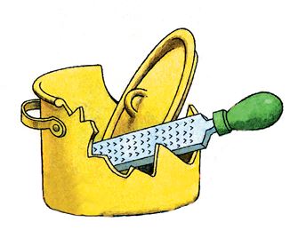 Я передал ему сковородку, и он принялся скоблить её по краям напильником.