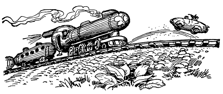 Труба у этого паровоза торчала не вверх, а была загнута назад. Поэтому, когда из трубы вырывался пар, он вылетал назад, и реактивная сила толкала паровоз вперёд. Так он и двигался.