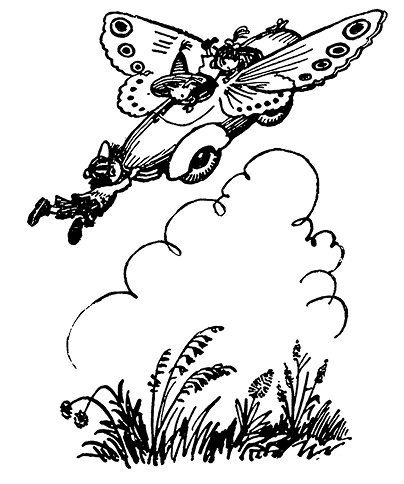 И сейчас же у автомобиля появились маленькие крылья, и он полетел над землёй, поднимаясь всё выше и выше. В то же время сзади послышался крик. Незнайка оглянулся и увидел, что Пёстренький вывалился из машины и болтался позади в воздухе, уцепившись руками за бампер. Взяв в зубы волшебную палочку, Незнайка перелез через спинку переднего сиденья и, схватив Пёстренького за курточку, пытался втащить его обратно в машину. Но это оказалось ему не под силу, так как тащить можно было одной рукой, а другой рукой приходилось держаться за кузов машины. Увидев, что Пёстренький теряет последние силы, Незнайка хотел сказать Кнопочке: «Возьми у меня изо рта палочку и скажи, чтоб машина спустилась вниз». Но так как у него в зубах была палочка, то вместо этих слов получилось:
