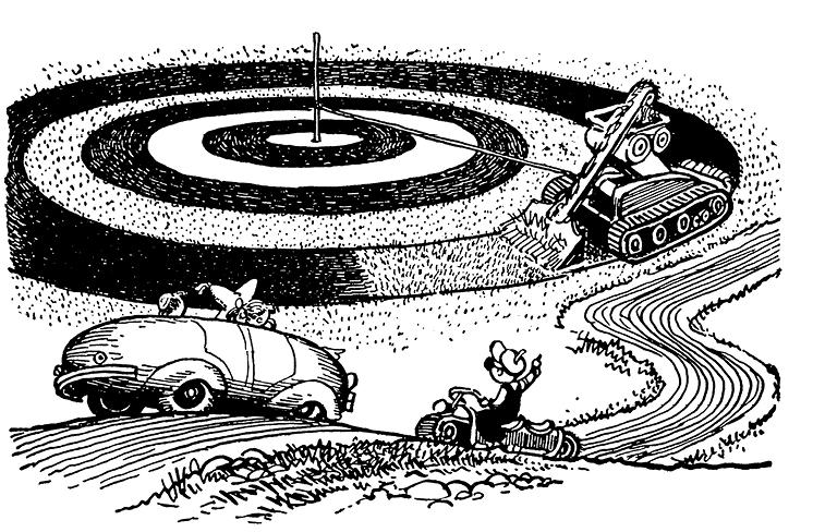 Кнопочка, которая не особенно интересовалась машинами, сказала, что уже пора ехать дальше. Но Незнайка во что бы то ни стало хотел дознаться, в чём тут дело. Присмотревшись внимательней, он заметил, что посреди поля стоял столб, вокруг которого был намотан металлический трос. Конец этого троса был привязан сбоку к машине, которая ходила, таким образом, по кругу, как на привязи. Трос постепенно разматывался и удлинялся, благодаря чему машина описывала всё более широкие круги.