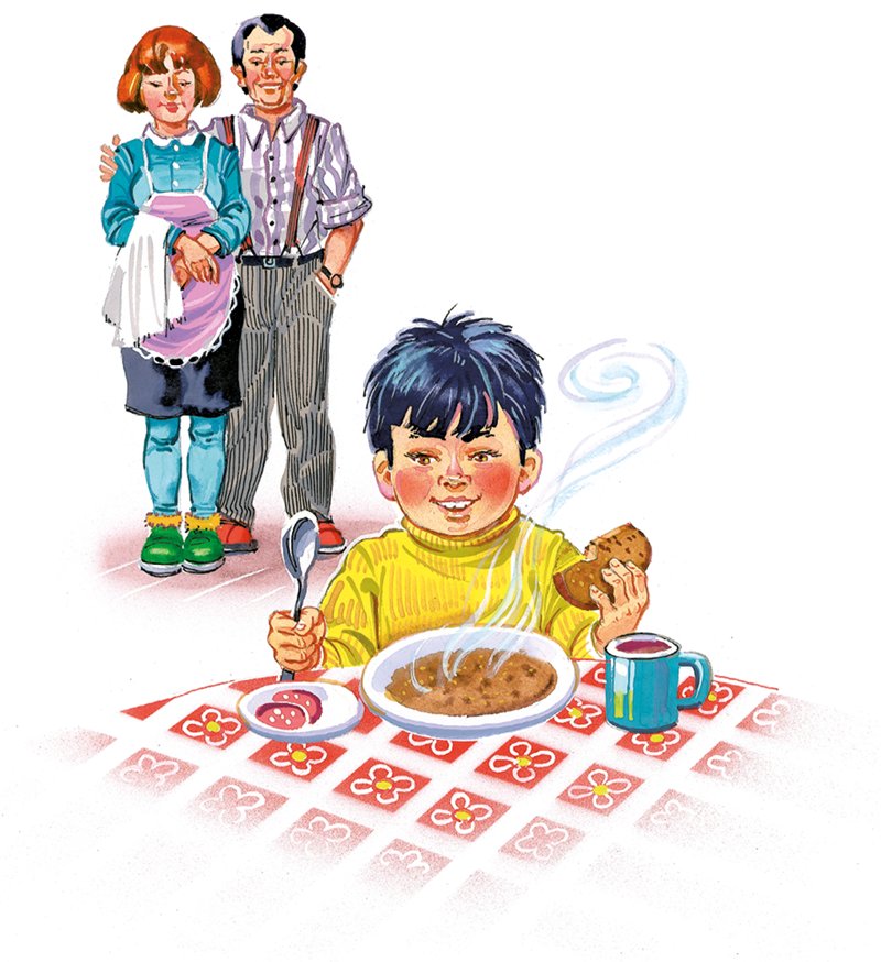 За ужином Гена ел с большим аппетитом. Глядя на него, папа и мама радовались. Им всегда почему-то казалось, что Гена ест мало и от этого может похудеть и заболеть. Увидев, как он уписывает за обе щеки гречневую кашу, отец потрепал его рукой по голове и, засмеявшись, сказал:
