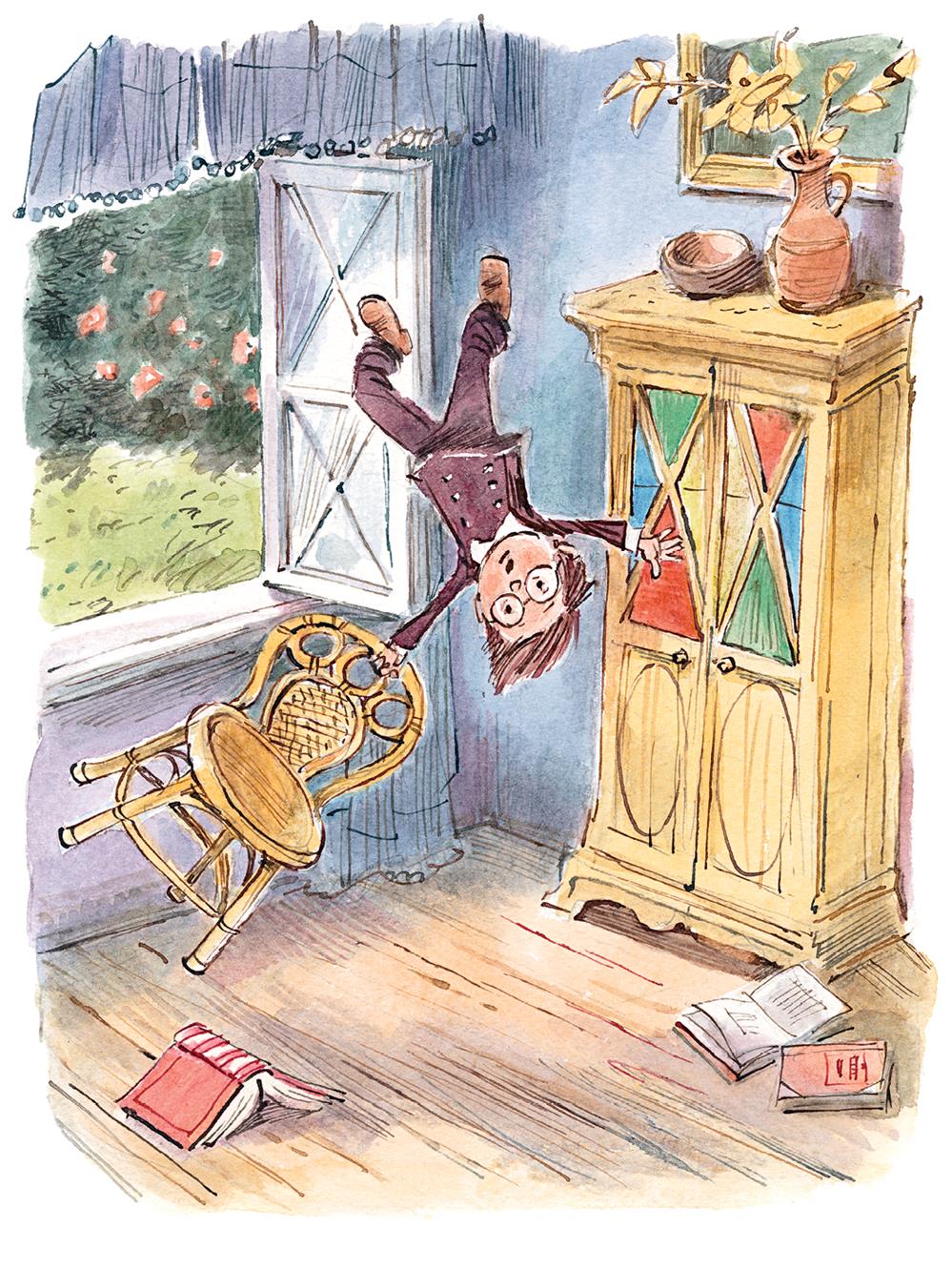 Вместе с головокружением у Знайки появилось какое-то странное ощущение зависания вниз головой, то есть ему на какой-то миг показалось, будто он перевёрнут кверху ногами. Оглядевшись по сторонам и убедившись, что он вовсе не вверх ногами, Знайка закрыл дверцу шкафа и уже хотел выпрямиться, но как раз в это время его снизу словно толкнуло что-то и подбросило под потолок. Ударившись о потолок головой, Знайка упал на пол и, чувствуя, что его как бы подхватило ветром и куда-то несёт, ухватился рукой за стул. Это ему, однако ж, не помогло удержаться на месте. В следующее мгновение он уже снова был в воздухе, и притом вместе со стулом в руках. Отлетев в угол комнаты, Знайка ударился спиной о стену, отскочил от неё, словно мячик, и полетел к противоположной стене. Зацепив по пути стулом за люстру и расколотив лампу, Знайка врезался головой в книжную полку, отчего книги разлетелись в разные стороны. Увидев, что от стула никакой пользы нет, Знайка отшвырнул его от себя. В результате стул полетел вниз и, ударившись о пол, подскочил кверху, словно резиновый, сам же Знайка отлетел к потолку и, отскочив от него, полетел вниз. По пути он столкнулся с летящим навстречу стулом и получил удар спинкой стула прямо по переносице. Удар был настолько силен, что Знайка ошалел от боли и на некоторое время перестал трепыхаться в воздухе.