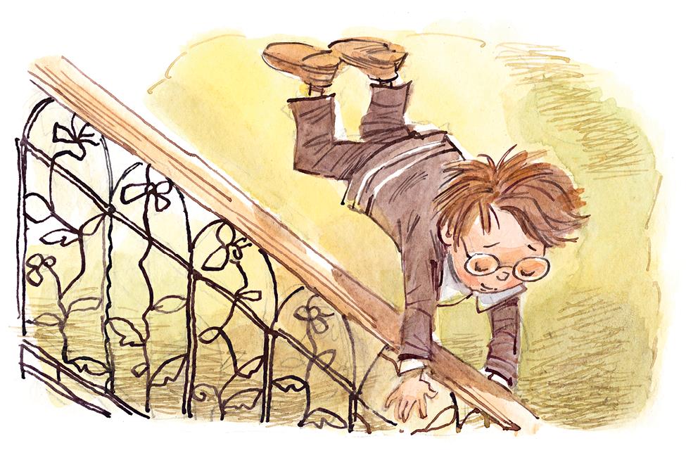 В конце концов Знайка всё же придумал хороший способ. Дотянувшись до перил, он стал спускаться, цепляясь за перила руками. Наверно, со стороны это выглядело очень смешно, потому что Знайкины ноги болтались в воздухе, как у комара, и, по мере того как он опускался всё ниже, ноги его задирались всё выше и он всё больше перевёртывался вниз головой.