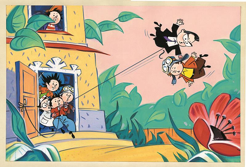 Знайка схватил Винтика под мышки, взвалил на спину и потащил сквозь пролом к дому. Сделав несколько шагов, Знайка почувствовал, что тяжесть как будто уменьшилась, а сделав ещё шаг, он неожиданно оторвался от земли и взвился вместе с Винтиком в воздух.