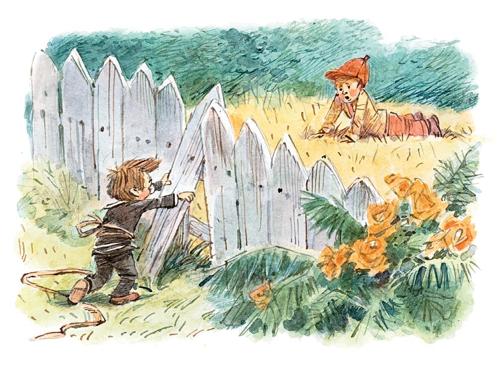 Пилюлькин отправился за хлебом с вареньем, а Шпунтик, обвязавшись верёвкой, пробрался в конец двора. Почувствовав, что снова приобрёл вес, он привязал конец верёвки к забору и закричал коротышкам: