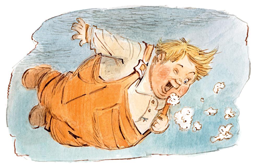 Знайка схватил Винтика под мышки, взвалил на спину и потащил сквозь пролом к дому. Сделав несколько шагов, Знайка почувствовал, что тяжесть как будто уменьшилась, а сделав ещё шаг, он неожиданно оторвался от земли и взвился вместе с Винтиком в воздух.