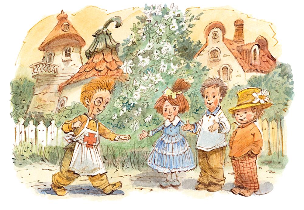 Некоторые самые любопытные жители отправились к домику Знайки и, увидав во дворе Пончика с перевязанным носом, спросили: