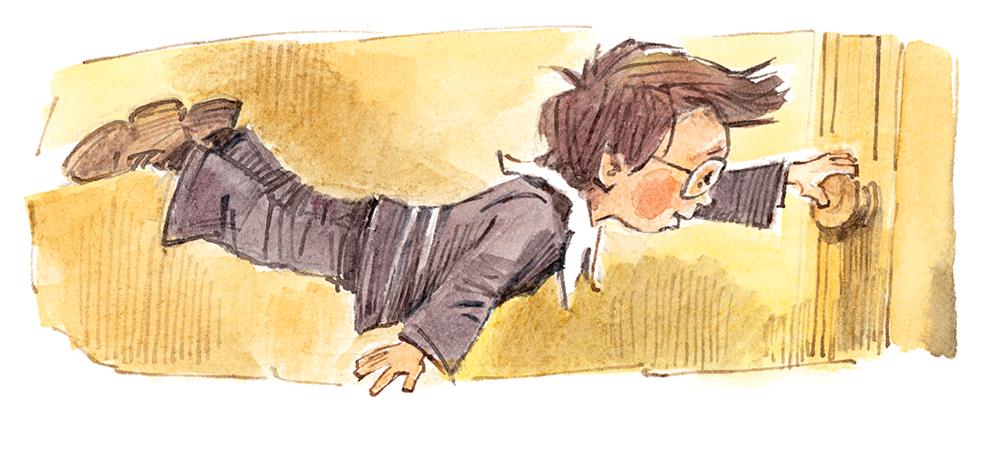 От волнения его движения были, однако, не очень точно рассчитаны, поэтому, прежде чем попасть, куда было нужно, он совершил целое кругосветное путешествие по комнате. Добравшись наконец до шкафа, он ухватился за его дверцу руками и повис перед ним в горизонтальном положении с болтающимися в воздухе ногами.