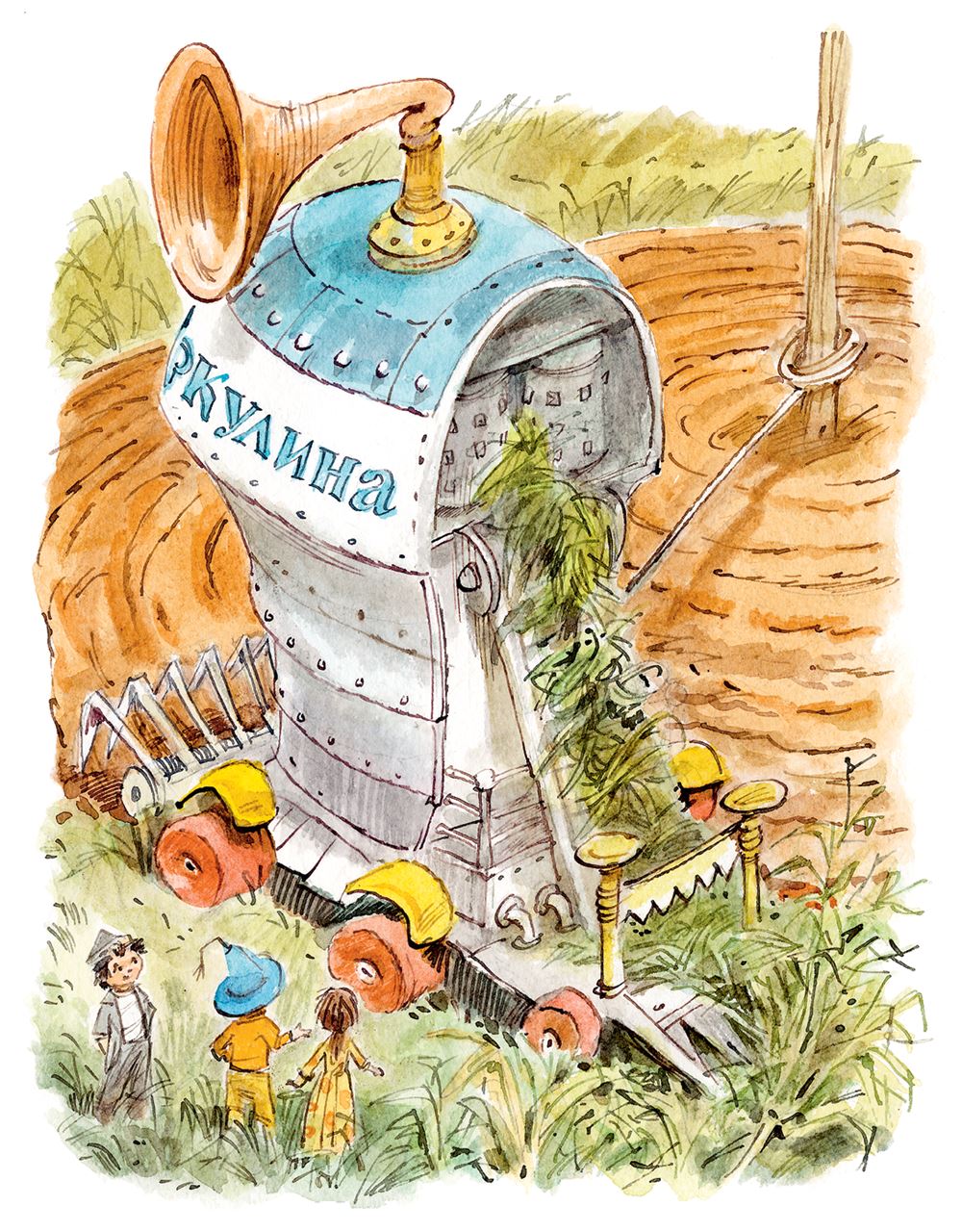 Сказав это, машинист-коротышка отцепил трос, сел за руль и подъехал на комбайне к другому столбу. Здесь он привязал комбайн к тросу, слез на землю и свистнул два раза в свисток. Комбайн зажужжал и начал вращаться вокруг столба, вспахивая землю.