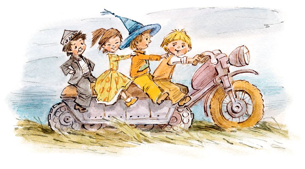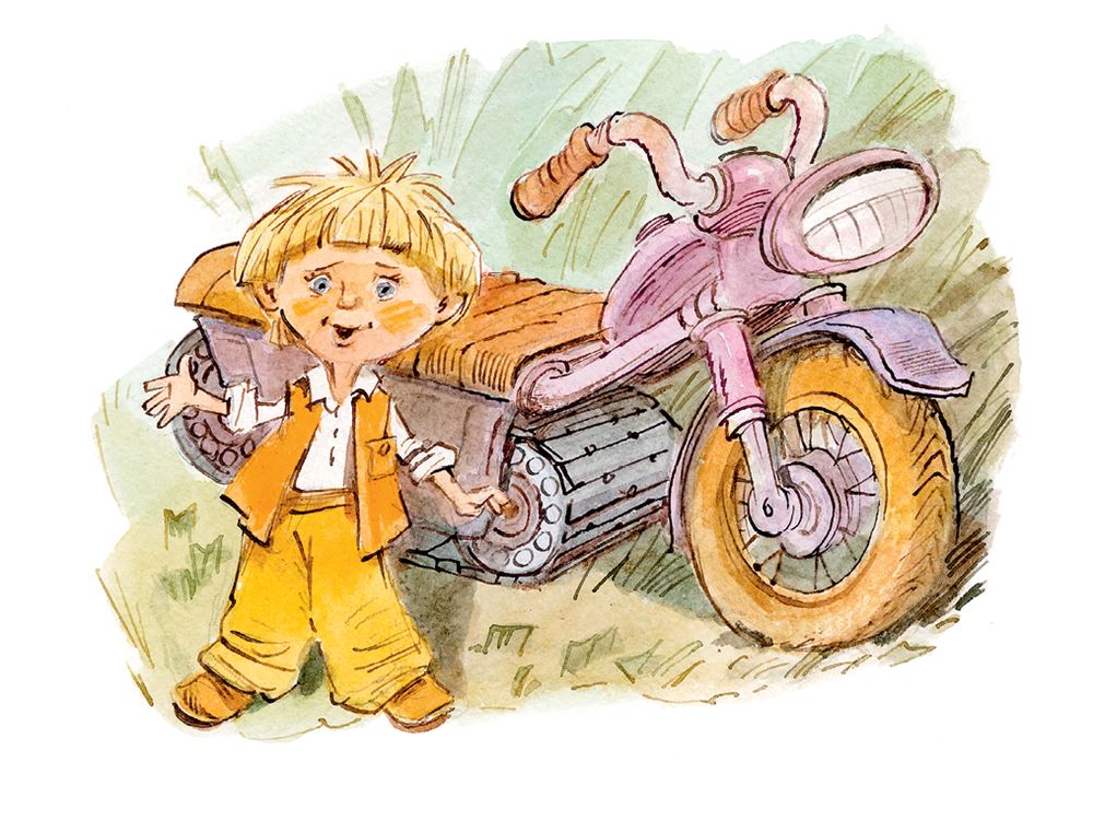 Все согласились и уже хотели садиться в машину, но коротышка сказал, что лучше ехать всем на его мотоцикле. К удивлению путешественников, у мотоцикла оказалось такое длинное сиденье, что на нём поместились все четверо. Первым сел машинист, за ним – Незнайка, потом – Кнопочка и самым последним – Пёстренький.