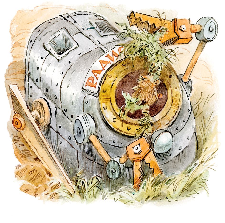 Все снова сели на мотоцикл, спустились с холма и, промчавшись по краю вспаханного поля, остановились у комбайна, который с виду был похож на покрытый бронёй автобус с какими-то четырёхугольными воронками наверху. У этого автобуса не было ни окон, ни дверей, ни колёс, да к тому же он чуть ли не наполовину зарылся в землю. В передней части машины было широкое отверстие, сбоку имелся нож, который, по мере продвижения комбайна вперёд, подрезал землю. Две железных механических руки, как в снегоуборочной машине, всё время загребали подрезанную землю вместе с травой и заталкивали всё это в отверстие. Вверху над отверстием была надпись: «Радиолярия».
