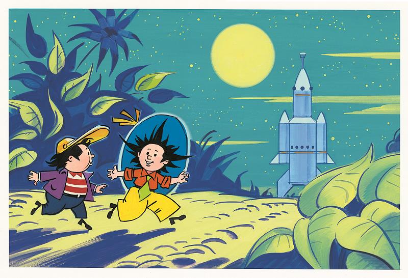 Было уже совсем поздно, когда Незнайка и Пончик добрались до Космического городка. Взошла Луна, и вокруг стало светлей. Прокравшись мимо домов, наши друзья очутились на краю круглой площади, в центре которой возвышалась космическая ракета. Она поблёскивала своими стальными боками в голубоватом свете Луны, а Незнайке и Пончику казалось, что ракета светится сама собой, словно была сделана из какого-то светящегося металла. В её очертаниях было что-то смелое и стремительное, неудержимо рвущееся кверху: казалось, что ракета вот-вот сорвётся со своего места и полетит ввысь.