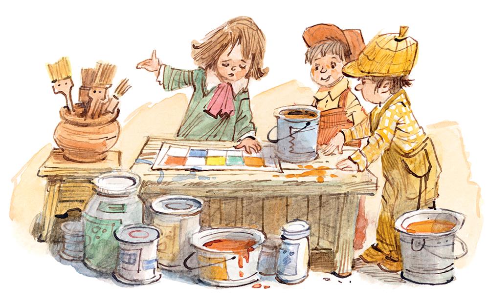 Жители Цветочного города моментально включились в работу. Кто трудился на прокладке дороги, кто устанавливал столбы для электролинии, кто сажал цветы. Многим нашлась работа по внутренней отделке домов. Тюбик взял на себя руководство всеми малярными работами: составлял краски, указывал, в какие цвета красить стены и крыши домов.