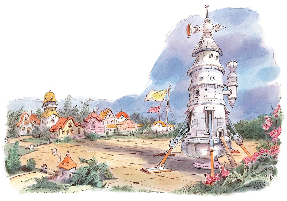 Было уже совсем поздно, когда Незнайка и Пончик добрались до Космического городка. Взошла Луна, и вокруг стало светлей. Прокравшись мимо домов, наши друзья очутились на краю круглой площади, в центре которой возвышалась космическая ракета. Она поблёскивала своими стальными боками в голубоватом свете Луны, а Незнайке и Пончику казалось, что ракета светится сама собой, словно была сделана из какого-то светящегося металла. В её очертаниях было что-то смелое и стремительное, неудержимо рвущееся кверху: казалось, что ракета вот-вот сорвётся со своего места и полетит ввысь.