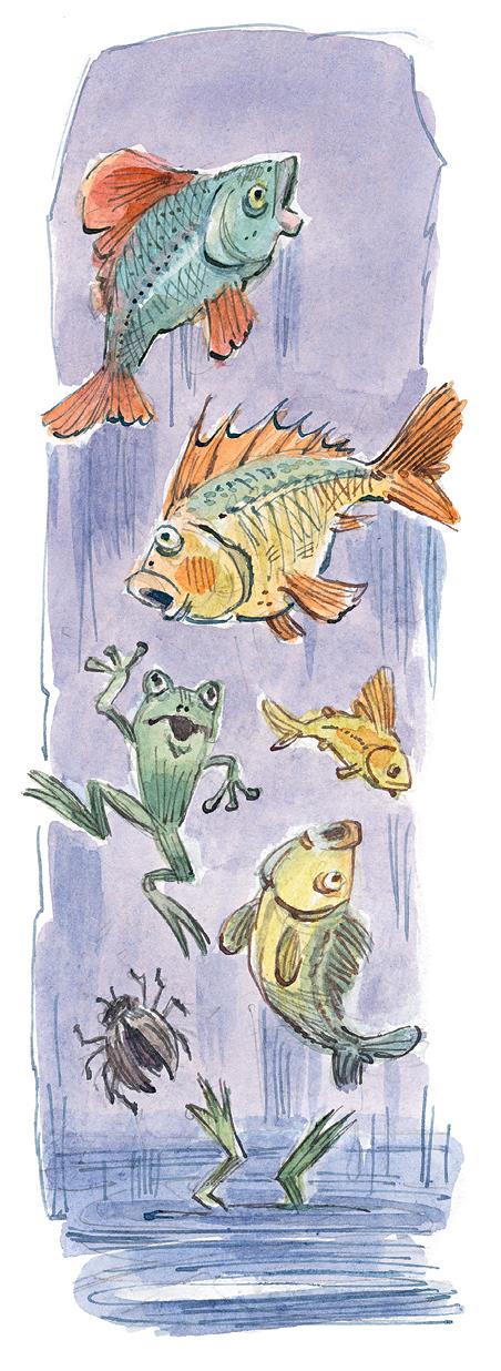 Очутившись на берегу реки, Незнайка включил прибор невесомости и принялся глядеть в воду. В первый же момент он заметил, что невесомость очень странным образом подействовала на поведение рыб. Одни из них опустились хвостиком вниз и вертелись, как балерины; другие опустились вниз головкой и тоже вертелись; третьи плавали вверх животом. Однако через некоторое время многие из них освоились с состоянием невесомости и стали, как обычно, резвиться в воде. Но вот одна из рыбёшек, попытавшись поймать муху, вившуюся над водой, выпрыгнула из реки и беспомощно закувыркалась в воздухе. Теперь уже сила тяжести не притягивала её книзу, и рыба при всём желании не могла вернуться в реку. Вслед за первой из воды выплеснулась вторая рыба. Не прошло и пяти минут, как над поверхностью реки заплясали, поблёскивая на солнышке, рыбы, лягушки, тритоны, жуки-плавунцы и прочая водяная живность.